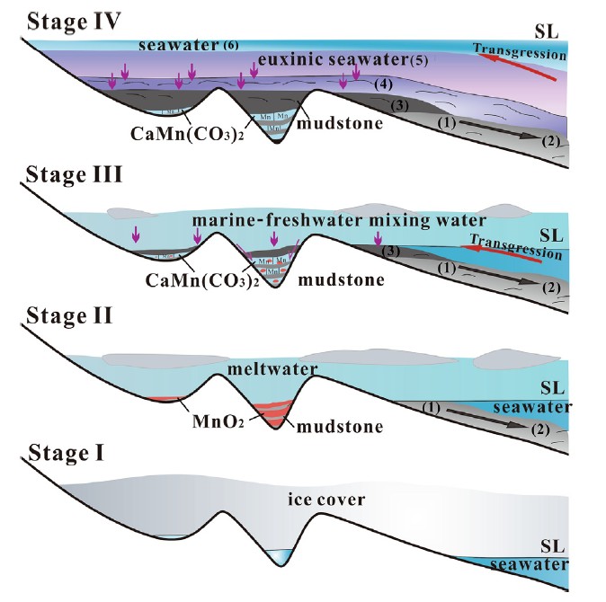 2 大塘坡组超重黄铁矿和锰矿的形成模式。Stage I: 南沱组末期;Stage II: Sturtian雪球刚消融时发育淡水沉积;Stage III:海侵开始,淡水-海水混合;Stage IV: 最高海泛面,透光带硫化