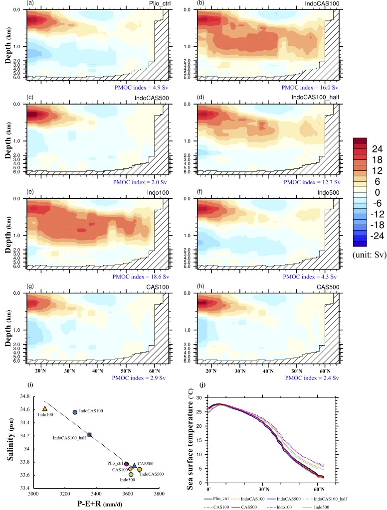 图1 (a-h)不同试验下的北太平洋经圈翻转环流状态; (i) 亚北极太平洋淡水通量与盐度的关系;(j)纬向平均的北太平洋海表温度。(Plio_ctrl:上新世控制试验;IndoCAS100: 热带海道同时打开海深100米;IndoCAS500:热带海道同时打开海深500米;IndoCAS100_half: 热带海道同时打开海深100米,但海道宽度减少50%;Indo100(500): 仅印尼海道打开100(500)米;CAS100(500): 仅巴拿马海道打开100(500)米)