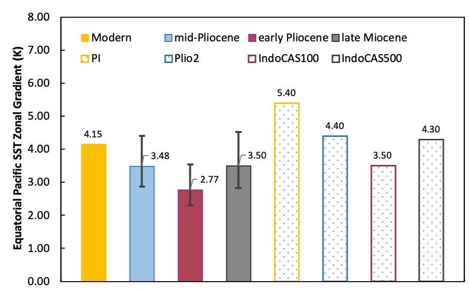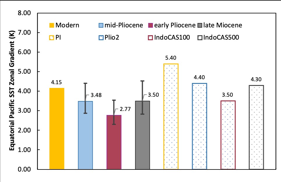 该研究进一步指出,热带海道的变化同时可影响赤道太平洋的上升流强度,可在一定程度上促进由地质记录指示的赤道东太平洋生物勃发现象。此外,模型模拟的热带海道从深至浅到最终关闭(500米→100米→关闭)所导致的热带太平洋东西温度梯度的变化型态与地质记录也较为吻合(图2),这从侧面印证了热带海道对晚中新世-上新世气候演化的可能贡献。