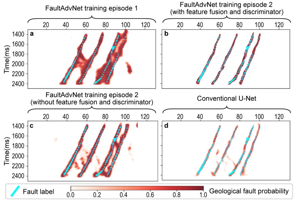 通过模块功能对比分析(图2),他们评估了FaultAdvNet模型中各模块的重要性和彼此间的协同关系,验证了该网络架构的优越性。通过与 U-Net模型的对比,论证了针对特定任务而设计的神经网络架构更适合解决专业问题。