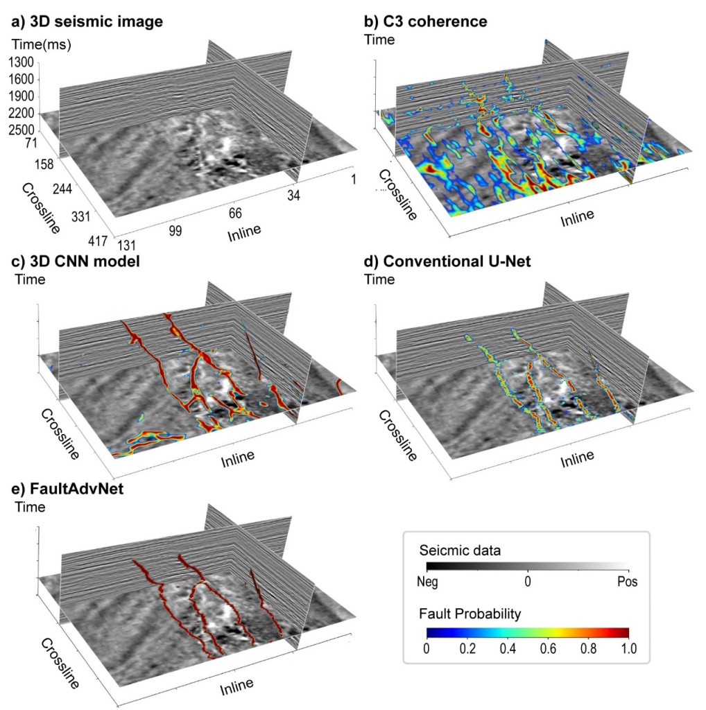 墨西哥湾地区的案例研究表明,相比于传统方法(如相干算法)和其他智能方法(包含多种CNN深度学习方法),FaultAdvNet的三维预测结果具有良好的连续性、清晰的边界和更高的置信度(图3)。该方法作为计算机视觉和地球物理学科的交叉研究,在各种地质识别任务(如河道、盐丘和气烟囱等)中有着广阔的应用前景。