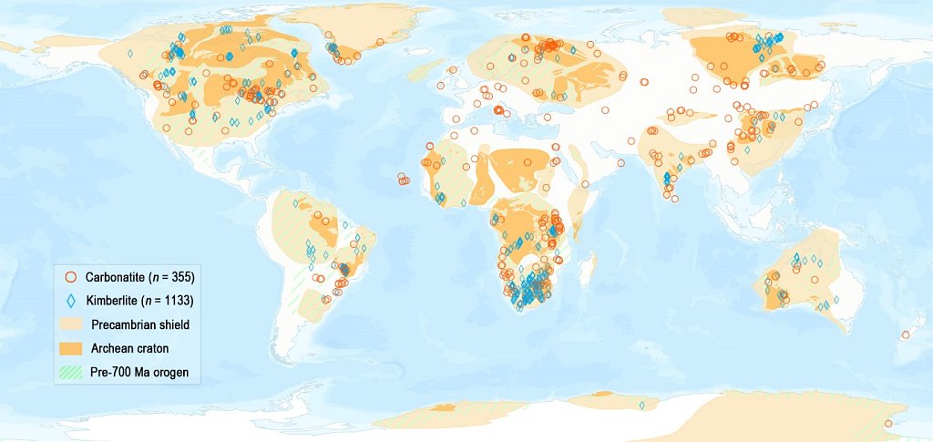 图1 具有可靠年龄的碳酸岩和金伯利岩全球分布图(金伯利岩数据来自Tappe et al., 2018)