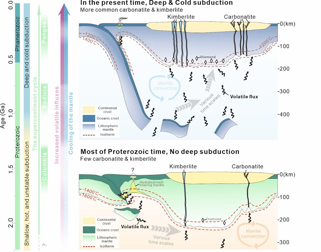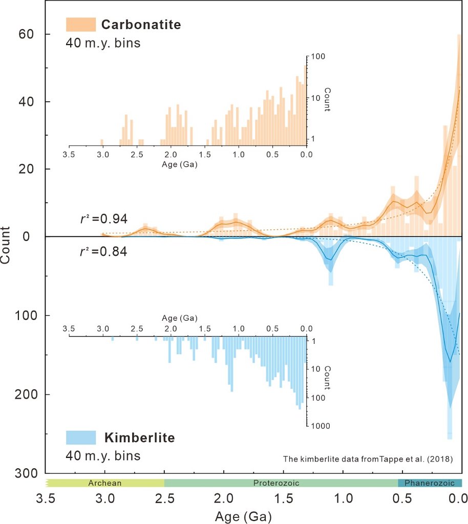 陆下岩石圈地幔(SCLM)是地球内外相互作用的边界层,既对地球内部热敏感,也与外部圈层构造体制相关,它贡献的两种不同的富挥发分岩石(碳酸岩和金伯利岩)可以上升到地表并保留下来。这使得这两种成因上相似、与热和构造相关、均具有一阶长期趋势和二阶周期韵律的岩石记录可以互相支持,并可作为探究地球热-构造演化史的绝佳着手点。