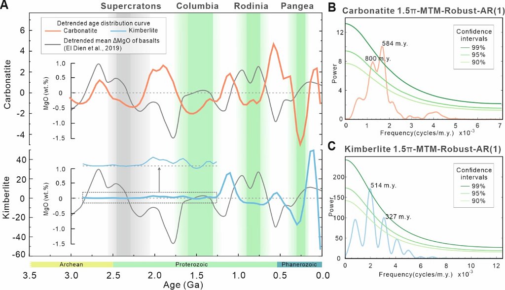 接下来通过对频数分布曲线进行分析发现,二者具有相似的幂率分布(图2),这与当前正在讨论的金伯利岩一阶长期趋势反映地幔长期冷却还是10亿年左右地球构造体制转变相一致。一个自然而然的推想是,如果影响因素是真实存在的,它应该在一阶长期趋势和二阶韵律中均有体现,并且在成因上相似的碳酸岩也应该具有相同的规律。基于这项考虑,去掉了两种岩石记录的一阶趋势,并对他们去趋势后的波动曲线进行了频谱分析(图3)。结果表明,二者具有一致的波动和超大陆旋回周期(400-800 m.y.),二阶韵律与超大陆旋回的耦合明确了构造是两种岩石记录的重要影响因素。