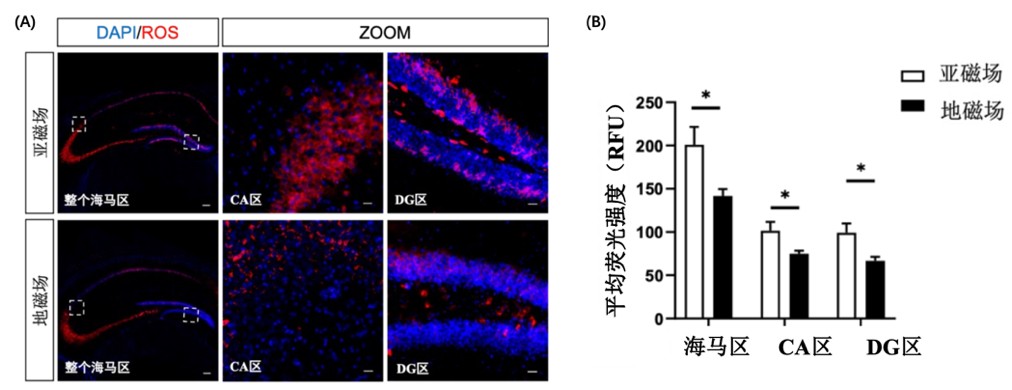 图2 地磁场和亚磁场暴露8周对小鼠整个海马区活性氧(ROS)水平影响对比结果。(A)地磁场/亚磁场组小鼠海马区的ROS染色(红色)的代表性荧光照片。(B)地磁场/亚磁场组小鼠海马区ROS水平定量统计结果