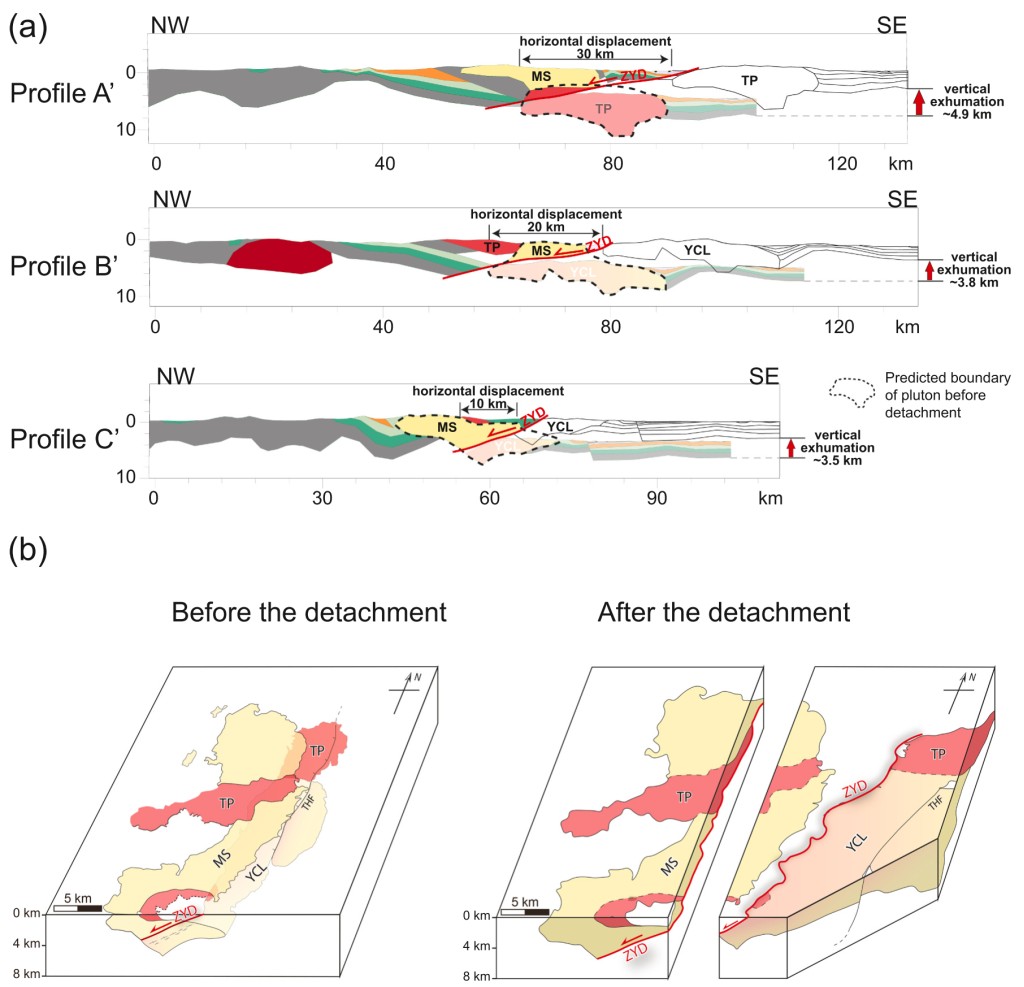 大陆地壳在受到挤压或伸展应力下容易发生变形,进而产生大型的断裂带,是研究大陆地壳结构和流变性质演化的最佳场所。当挤压应力主导时,岩石中产生的脆-韧性变形会逐渐集中,进而产生基底逆冲断层,导致块体运动和显著的地壳缩短,协调了块体间的会聚;当伸展作用主导时,壳内发育大规模的低角度拆离断层,则揭示了水平伸展和垂向剥露之间的关系。作为大陆变形的载体,基底逆冲断层或拆离断层在大陆内部广泛发育,但是由于缺少地质、地球物理协同研究获得的断层几何学-运动学数据,这些大型断层在地质历史时期的精细变形-扩展过程其实并不清晰。因此,获得断层(基底滑脱或拆离断层)的时空四维演变历史是理解大陆变形的关键。