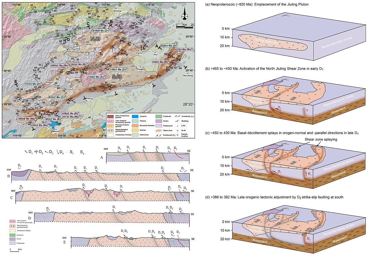 通过详细的构造地质学观察和同位素年代学测试,作者识别出了早古生代九岭地区两条近东西向的主要韧性剪切带,在其两端分别演化出多条次级韧性剪切带(图2)。结合岩石磁学和重力,他们重建了九岭的几何结构,并揭示出九岭基底逆冲断层的精细时空演化:(1)基底逆冲断层首先沿北侧韧性剪切带发育,将九岭岩体分割为未变形的北部和南部块体;(2)随后分支出南侧的韧性剪切带,并形成了叠瓦状逆冲结构;(3)最后两条主要韧性剪切带不断扩展,形成次级剪切带,并将岩体切割成更小块体的叠瓦构造,也形成网络状的断层系统(图2)。这种同一温度体系下,从叠瓦状向网络状逐级演化的基底逆冲断层系统表明,局部变形的叠瓦构造与弥散变形的地壳流其实是个连续演化的过程,受地壳性质和强度控制,因此也可以解释为何青藏高原周缘地壳流与叠瓦式挤压构造在不同区域发育。