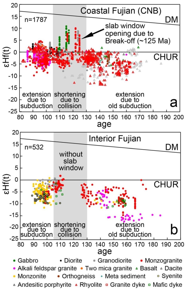 3)在华南整体处于岩浆平静期时,长乐-南澳构造带却有花岗岩体侵位。通过对该构造带及其临近区200 Ma以来的变质岩、花岗岩和火山岩的锆石Hf同位素统计发现,εHf(t)在130 Ma(初始碰撞)之前为负值,125 Ma(初始碰撞之后5 Ma)突然陡增,105 Ma(碰撞结束)之后有降低的趋势(图3)。结合同碰撞期长乐-南澳构造带基性岩浆的活动,研究认为碰撞导致研究区地幔上涌,进而提出碰撞诱发俯冲板片断离和板片窗的张开,使得在华南岩浆平静期期间,在板片窗之上,同构造花岗岩线性分布于长乐-南澳构造带中(图4)。