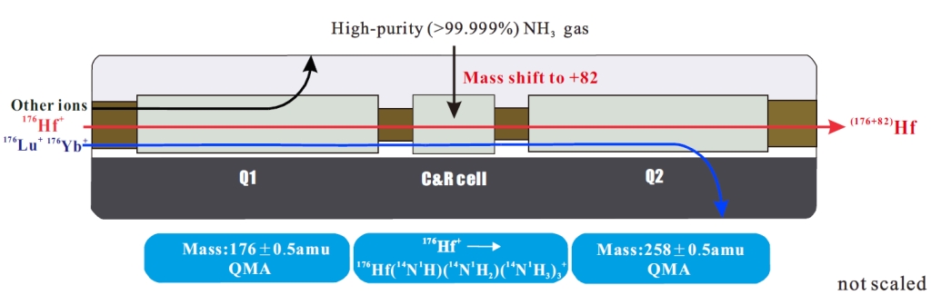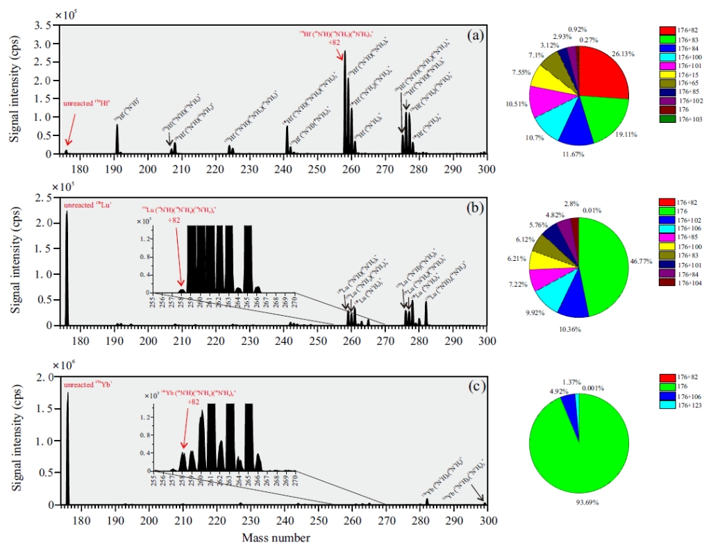 iCap TQ三重四级杆(其原理如图1所示),通过活化气体碰撞反应,实现了同质量数的母子体在线分离(图1)。氨气与目标元素往往具有非常复杂的反应产物,他们系统标定了Hf、Yb 和Lu与氨气的反应产物(图2),发现通过测定(176+82)Hf (表达为:176Hf(14N1H)( 14N1H2) (14N1H3)3, 质量偏移+82),可有效规避176Lu和176Yb对176Hf/177Hf测定的同质异位素干扰。