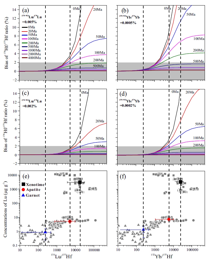 176Lu-176Hf的β衰变体系,其半衰期(37.13Ga)相较于87Rb-87Sr, 147Sm-143Nd和 187Re-187Os体系更短,在对年轻样品进行定年时更具有优势;同时母体Lu和子体Hf的地球化学性质比Sm和Nd的差异大,在地质过程中可以产生更显著的母子体分馏,有利于构筑高精度等时线。常见的用于Lu-Hf等时线定年的矿物主要有磷钇矿、磷灰石和石榴石。磷钇矿是确定沉积岩和高分异花岗岩和伟晶岩形成时代的优选对象,磷灰石是极为常见的副矿物,可以贯通于岩浆演化的各个主要阶段,是揭示岩浆分异过程的绝佳矿物,而石榴石可以敏感地记录变质作用温压条件的变化,是研究变质P-T-t轨迹的最理想矿物,并因此发展出著名的石榴石Lu-Hf地质年代学(Lu-Hf garnet geochronology)。