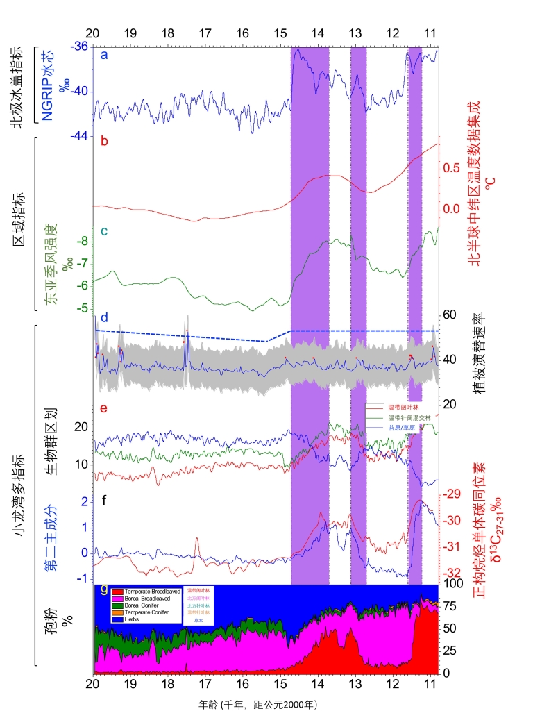 图1 小龙湾玛珥湖主要植被种类、植被演替速率、生物群区划、第二主成分、长链正烷烃单体δ13C与格陵兰冰芯δ18O、北半球中纬度温度和东亚石笋δ18O记录比较。紫色条带为千年尺度气候事件的过渡阶段