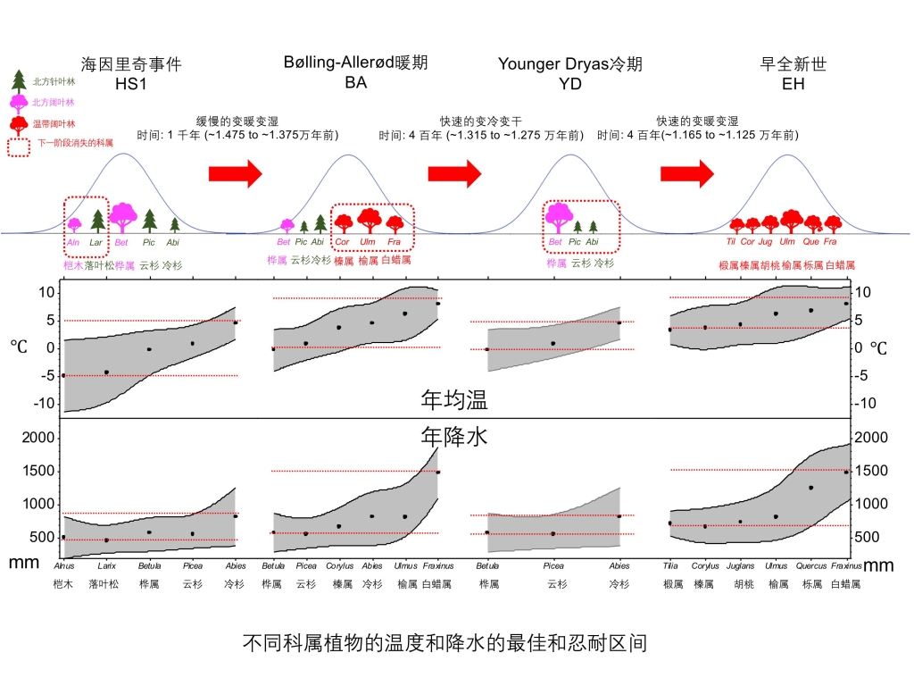 (1)在博林阿罗德暖期开始阶段(距今1.48-1.38万年前),东亚地区出现了1千年左右的增温变湿过程和广泛的森林扩张情况。森林生态系统经历了慢速和逐步的演替过程,即当气候变化较缓慢时,植被会逐渐适应气候变化,保留一部分原有的群落成分。