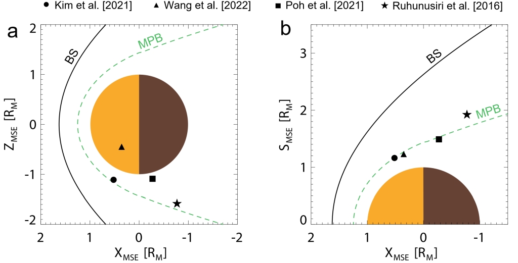 1 K-H波动事件在(aX-Z MSE平面和(c)柱坐标MSE中的投影。不同的事件用不同的几何形状标记。黑线和绿线分别代表弓激波和磁堆积边界