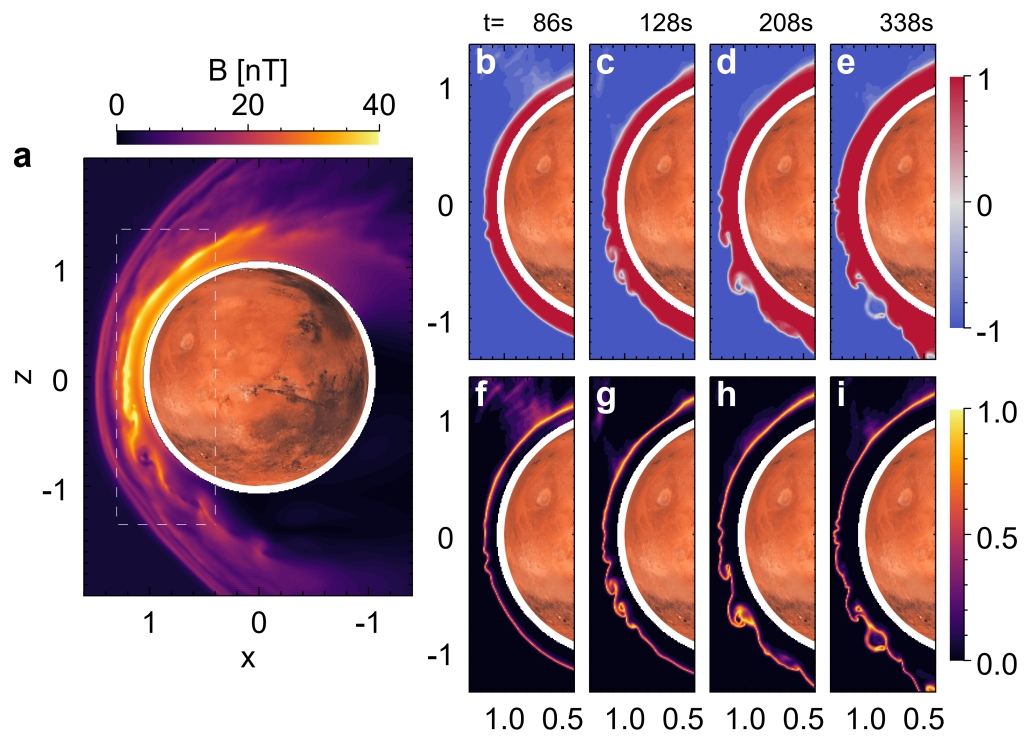 2a)磁场强度在t=208 s时的分布;(b-e) (nO-nH)/(nO+nH)(f-i)-氢混杂率的时序演化