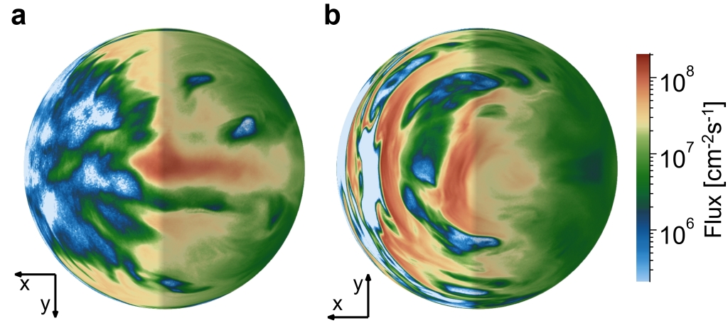 此外,研究者们还发现在-E半球存在着一种条带状结构,并伴随着氧离子通量增强(图4)。这种由KH波动产生的等离子体云贡献的氧离子净逃逸率可达1.5×1024 s-1,这与+E半球的逃逸率(1.8×1024 s-1)相当,表明这种循环出现的KH波动对火星大气演化过程至关重要。