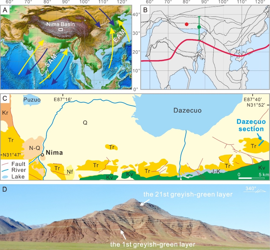 图1 尼玛盆地地质概况及剖面位置。(B中红点为ODSN重建的26 Ma时尼玛盆地的古位置,绿点为前人古地磁重建的25.1-22.3 Ma期间盆地古位置,红线为前人模拟的ITCZ;C图右侧粗蓝线指示达则错剖面所在;D为剖面上部照片,显示21个绿层)