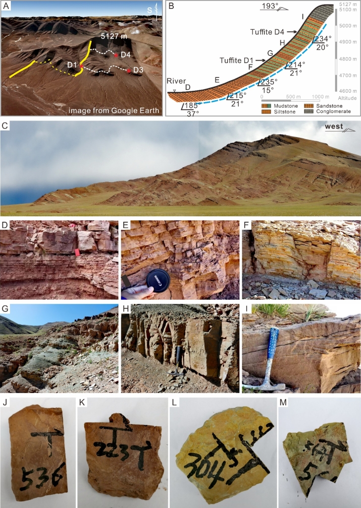 图2 尼玛盆地达则错剖面概况。(A中两段粗黄线为采样路径,D1、D3、D4为火山灰层所在;C为剖面上部侧视图;D-M为红绿层岩性照片)