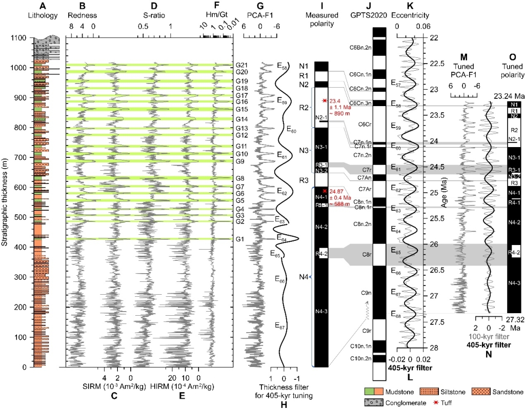 图3 达则错剖面环境磁学指标以及磁性地层、天文年代学模式。(A为岩性柱,含21层灰绿色层,以G1-G21标识;B-F为环境磁学参数;G为B-E曲线的第一主成分;H为G的代表长偏心率的深度滤波;I-J为磁性地层对比方案;K-L为理论偏心率及其405-kyr滤波;M-O为天文调谐后的尼玛气候序列及磁性地层)