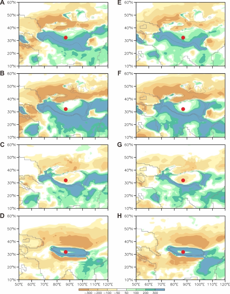 图6 模拟的亚洲气候对青藏高原演化的响应。(A-D为早渐新世,E-H为早中新世的结果;A-C、E-G为考虑相应的边界条件,仅改变青藏高原海拔高度所得到的降水量差值:A、E为2000减1000米;B、F为3000减1000米;C、G为3000减2000米;D、H基于2000米的原高原,考虑了适当北移;未减结果及具体实验参数请见原文Fig.S18-22 及 Table S4)