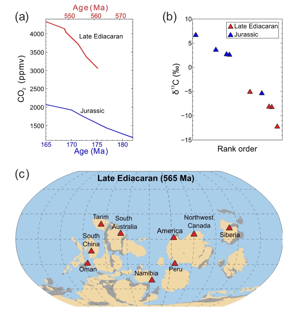 图1 (a-b)大气CO2浓度和海相碳酸盐碳同位素偏移的历史演变;(c)晚埃迪卡拉纪海相碳酸盐的空间分布