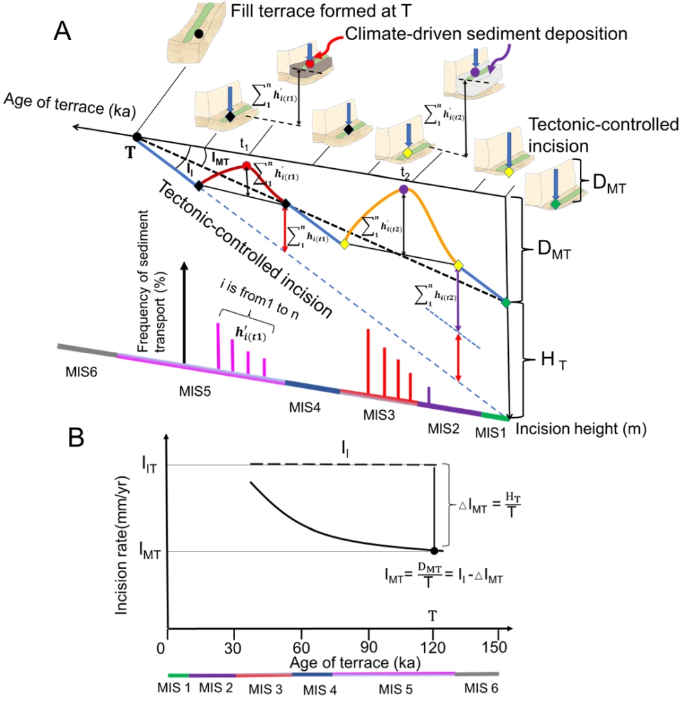 图2 (A)河流下切气候-构造耦合作用模型;(B)河流下切速率与阶地时间变化关系(河流下切速率的“Sadler”效应)