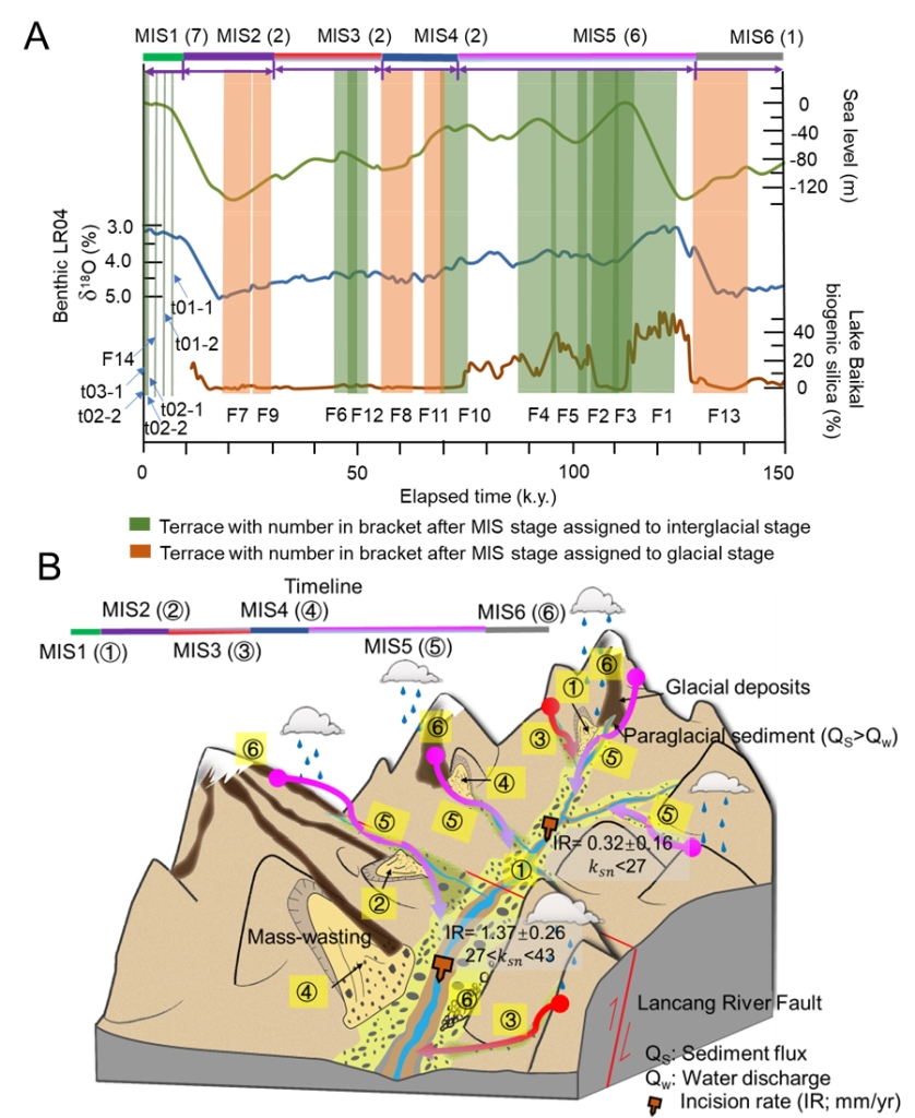 图1 流域内阶地形成、河流下切特征与气候、构造的时空关系图。(A)阶地形成与晚更新世以来冰期和间冰期的关系;(B)澜沧江断裂上下盘阶地时空分布和河流下切特征