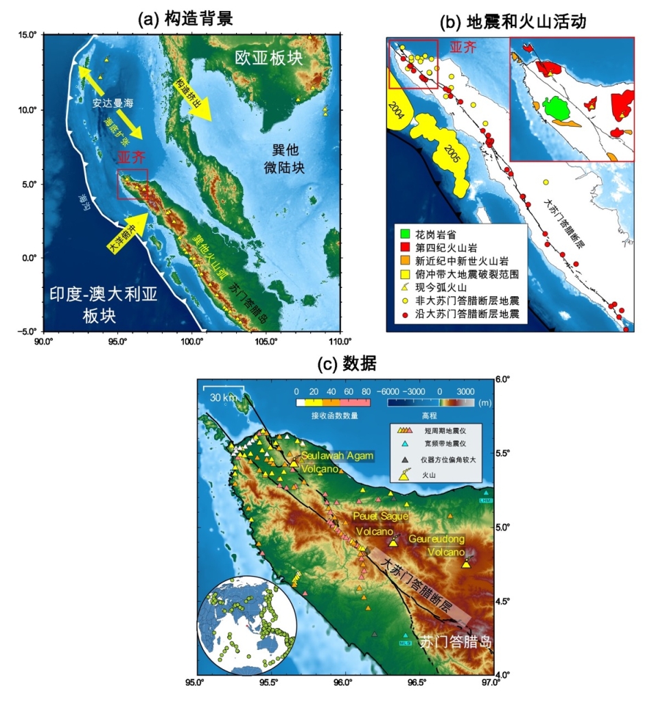 地壳厚度和熔融分数是认识火山区地壳变形和岩浆作用的基本信息。苏门答腊岛北部亚齐地区位于印度-澳大利亚板块相对巽他陆块俯冲作用和安达曼海海底扩张作用共同影响的大陆边缘地区(图1a),火山作用异常,即新近纪中新世弧火山活动停止,第四纪弧火山重新活化并向北迁移(图1b)。相对苏门答腊岛其他区域,亚齐地区海沟走向发生“大转弯”,转弯处与2004年9.2级和2005年8.7级大地震破裂分区位置相对应,这一复杂的构造变化导致苏门答腊北部存在强烈而广泛的壳内变形(图1b)。但是由于缺少密集地震观测,对该地区地壳结构和性质的约束不足,限制了对该地区异常火山作用和火山-断层相互作用的认识。