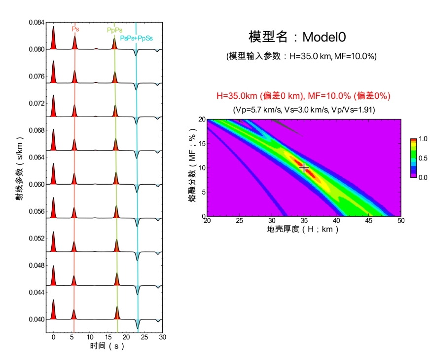 图2 H- 叠加搜索。通过网格搜索得到最优拟合接收函数Ps转换波震相和多次波震相到时的地壳厚度和熔融分数估计