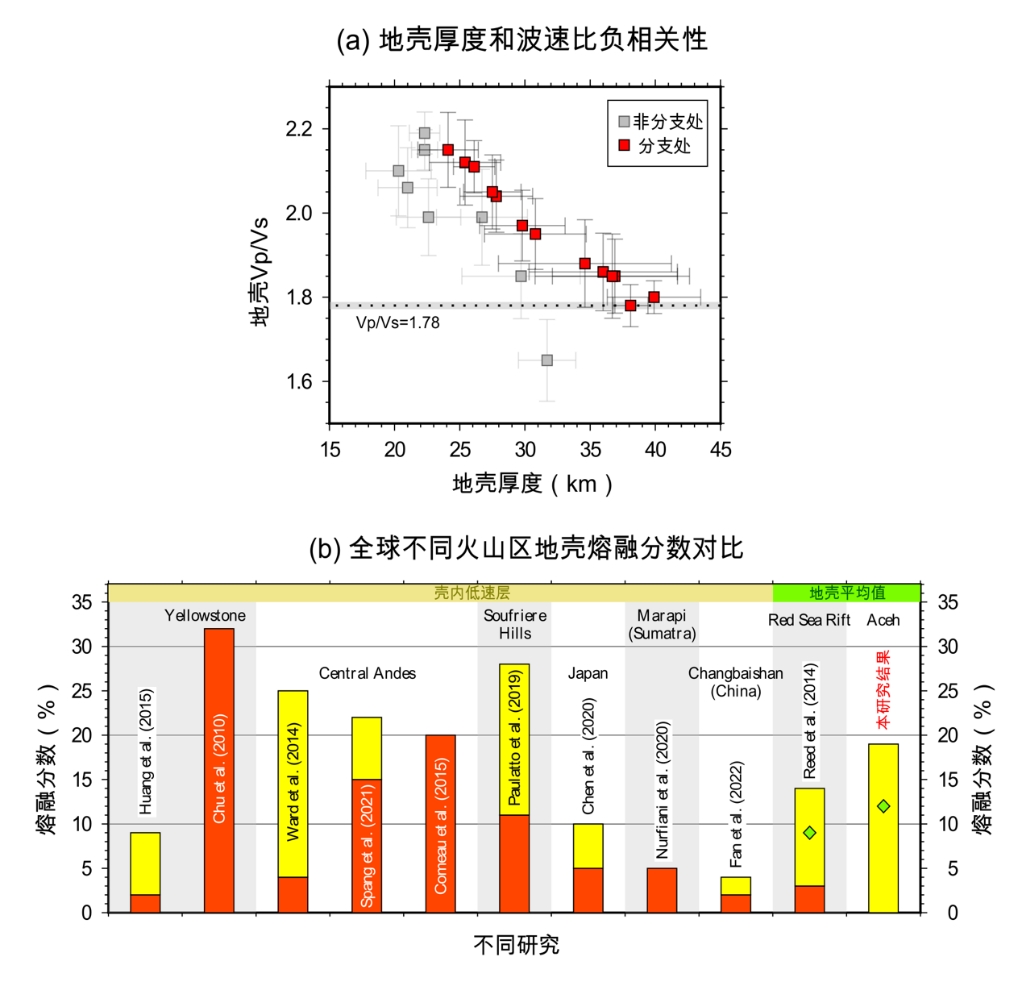 研究发现,亚齐地区地壳厚度约20-40 km,平均约29 km,与该地区Crust1.0模型结果相近(~31 km),且小于全球拉张型大陆地壳厚度平均值(~30.5 km),推测研究区地壳受到强烈的拉张作用而发生了减薄(图3a),可能与安达曼海的海底扩张作用有关(图1a)。研究区地壳熔融分数高至19%,平均约12%(对应波速比~1.65-2.19,平均值~1.98,图3b),与全球火山地区地壳波速比范围(>1.87)和全球其他火山区地壳熔融分数(~9%)相当(图4b)。熔融分数反映地壳熔融量体积比,平均约12%的熔融分数说明苏门答腊北部存在大量且广泛分布的壳内岩浆。研究还发现,在断层地表分支位置处地壳厚度和波速比(熔融分数)存在明显负相关性(图4a),可能说明地壳拉张变形促进了壳内断层活动,有助于壳内岩浆的补给和积累。