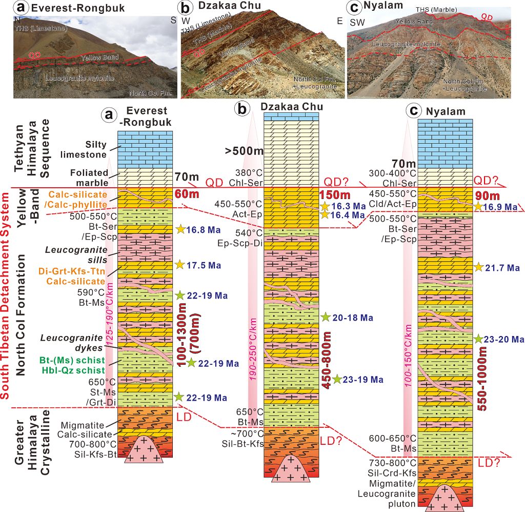 图2 喜马拉雅珠峰地区、扎嘎曲、聂拉木三个经典的藏南拆离系(STDS)剪切带剖面,及其中的剖面厚度、岩石矿物组合、变质温度、变质年龄