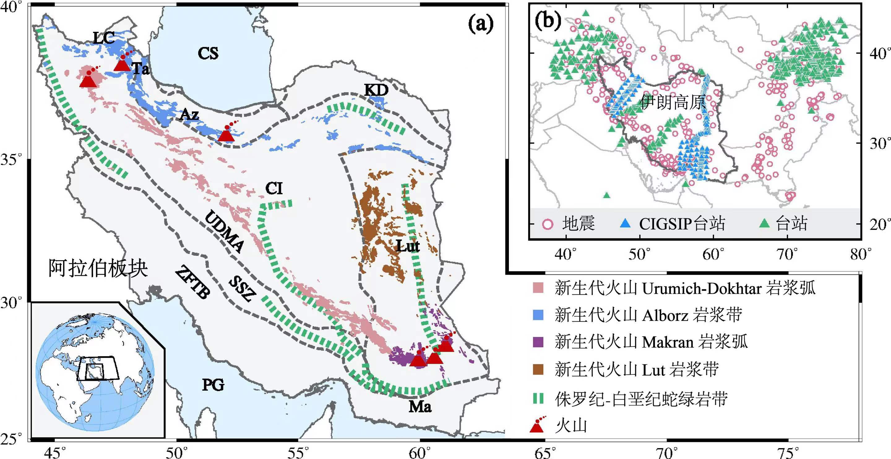 图1(a)伊朗高原新生代岩浆活动分布。Az: 阿尔博尔兹山脉;CI: 伊朗中部盆地;CS: 里海;KD: Kopet-Dogh山脉;LC: 小高加索山脉;Lut: Lut地块;Ma: Makran增生区;OS: 阿曼海;PG: 波斯湾;SSZ: Sanandaj-Sirjan变质带;Ta: Talesh山脉;UDMA: Urumieh-Dokhtar岩浆弧;ZFTB: 扎格罗斯褶皱推覆带。(b)地震事件和台站分布图。蓝色三角形代表 “中-伊伊朗高原地质地球物理综合探测(CIGSIP)”计划多期密集流动地震台阵位置