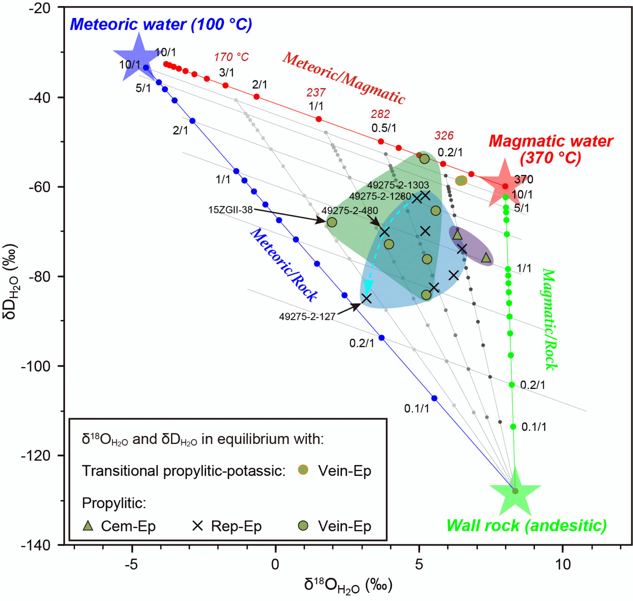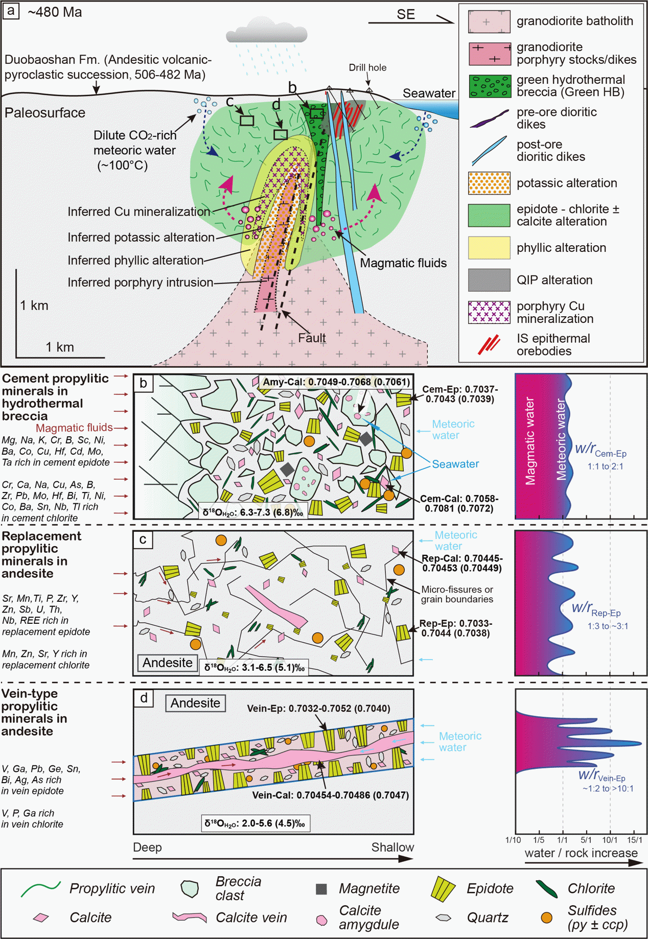 青盘岩化蚀变(绿帘石-绿泥石-方解石±阳起石±钠长石)是斑岩-浅成低温热液系统外缘的一种常见的蚀变组合,一般被认为是钾化蚀变的向外延伸。由于其一般具有比矿体范围大得多的分布面积、野外较高的辨识度以及绿帘石绿泥石中特定元素随距离成矿中心远近不同而呈现规律性变化被认为具有重要的找矿意义。但关于其成因仍有不少争议。一些矿床学家认为,青盘岩化蚀变形成于加热的大气水和围岩之间的水岩相互作用,其中大气水占主导地位,在此过程中除了一些挥发分(H2O、CO2、H2S/SO42-)外,几乎没有其他岩浆组分贡献。而另一些基于稳定同位素的研究表明,岩浆流体参与了斑岩铜矿床中青盘岩化蚀变的形成。中硫型浅成低温热液矿床(简称中硫型矿床)作为斑岩成矿系统的重要组成部分,其矿脉主要分布于比成矿略早的青磐岩化带中。中硫型矿床距离成矿岩体相对较远(相对斑岩矿床),该类矿床的青磐岩化是否有岩浆流体参与并不清楚。