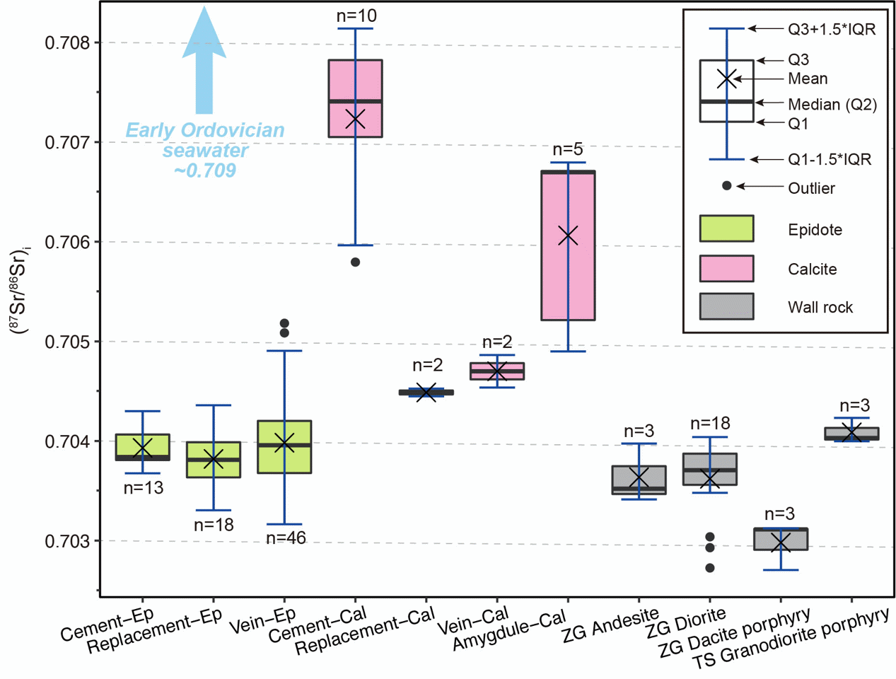 图2 争光不同产状青磐岩化绿帘石和方解石初始87Sr/86Sr比值箱线图