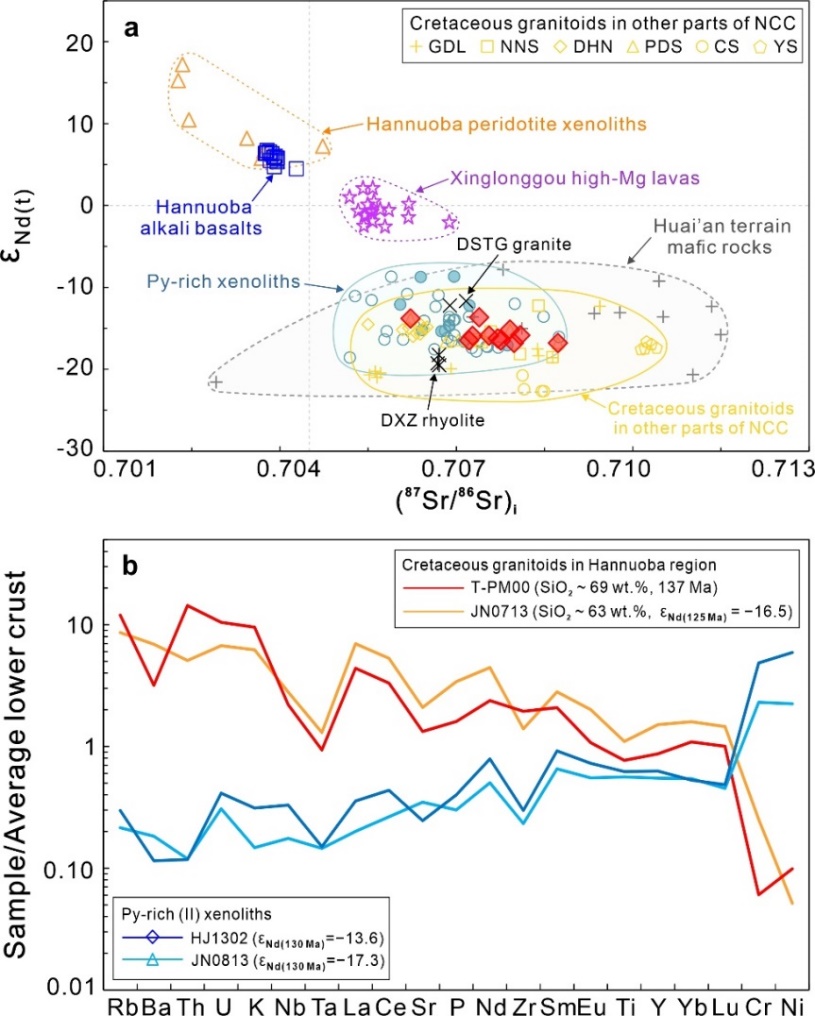 800彩票的博士研究生赵朗,在导师姜能研究员的指导下,与郭敬辉研究员以及其他合作者,将华北克拉通北缘张家口地区代表晚太古代基性下地壳的怀安地体中的基性麻粒岩、代表所谓新生下地壳的汉诺坝玄武岩中的基性麻粒岩捕虏体,以及下地壳起源的中生代花岗岩三者相结合,通过对这三类岩石的元素/同位素地球化学对比研究,发现了其成因联系的新规律: