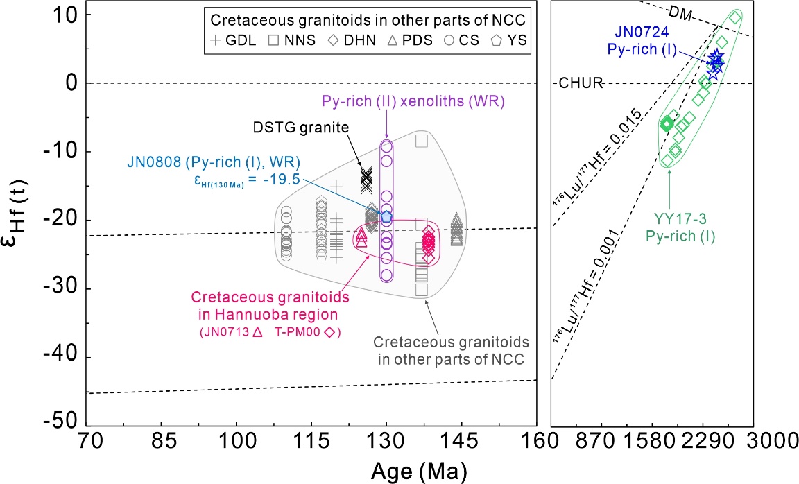 图2 基性麻粒岩捕虏体全岩Hf和中生代花岗岩岩浆锆石Hf同位素组成