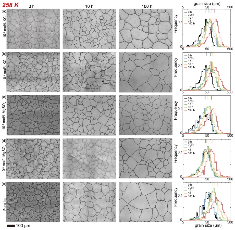 图1 掺杂冰样品以及在 258 K (约-15℃)退火的纯水冰样品的最高和最低浓度(分别为10−2和 10−5 mol L−1)的微观结构和晶粒尺寸分布直方图的光学图像。(a) 冰+10−2 mol L−1 KCl;(b) 冰+10−5 mol L−1 KCl;(c) 冰 + 10−2 mol L−1 MgSO4;(d) 冰+ 10−5 mol L−1 MgSO4;(e) 纯冰。 在每个图中,起始样品的显微照片位于第一列; 第二列和第三列分别是退火10小时和100小时的样品的显微照片;第四列是该杂质浓度的所有五个样品的晶粒尺寸分布直方图。底部显示的比例尺适用于所有面板。在直方图中,顶部的彩色线代表晶粒尺寸的算术平均值,每种颜色对应于一个退火时间