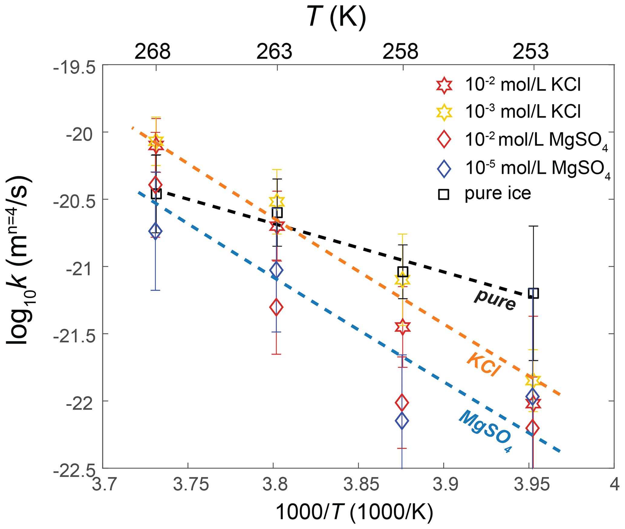 图2 掺杂冰和纯冰的晶粒生长速率常数k的温度依赖性。六角星代表掺杂 KCl 的冰,菱形代表掺杂MgSO4的冰。不同的颜色代表不同的杂质浓度。k的误差由垂直线表示。黑色虚线是对纯冰的晶粒生长速率的拟合。橙色和蓝色虚线分别是对掺杂KCl 和MgSO4的多晶冰的晶粒生长速率的拟合