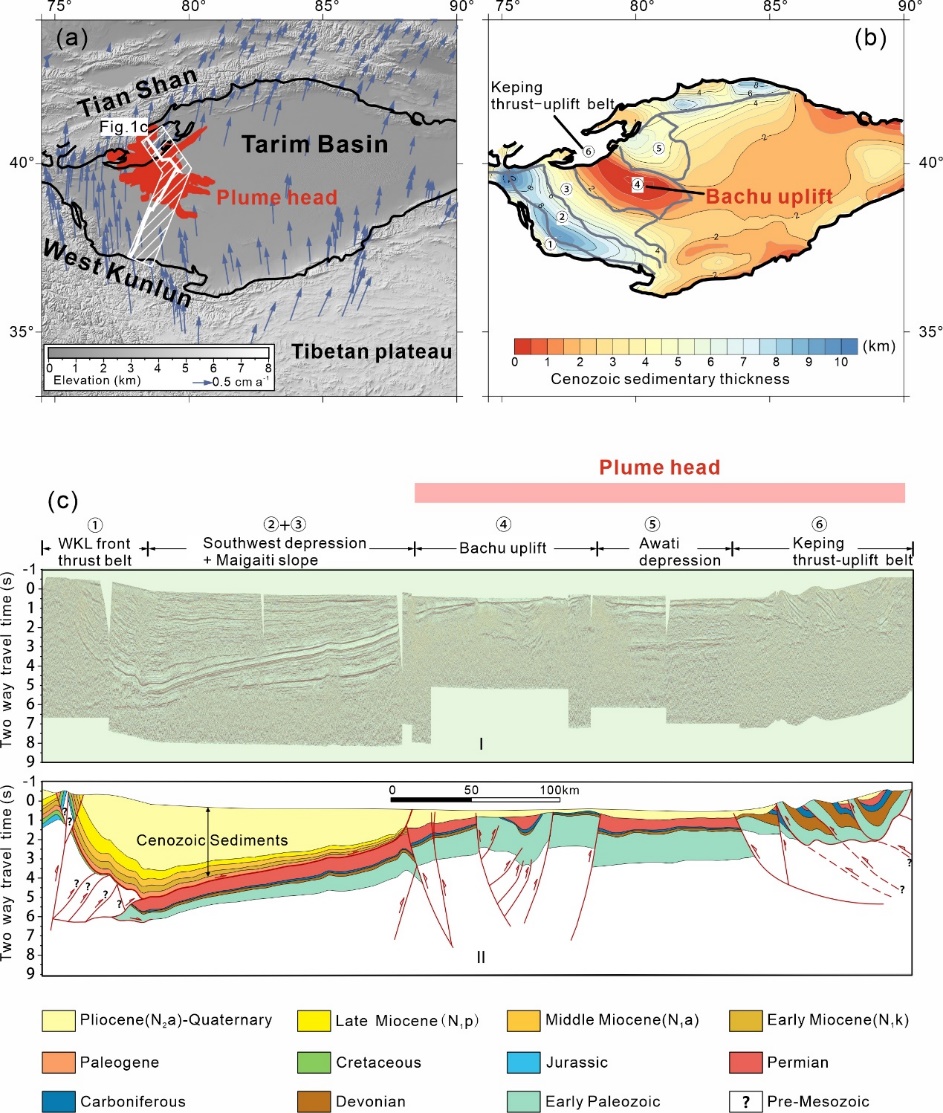 图1 (a)中国西北部的地质概况。红色区域表示二叠纪地幔柱柱头的空间范围,蓝灰色箭头表示相对于欧亚板块的GPS速度场;(b)塔里木盆地的新生代沉积厚度,灰蓝色线条表示西塔里木内划分的构造单元;(c)图1a中穿过地幔柱柱头的地震反射剖面及剖面解释。N2a:阿图什组;N1p:帕卡布拉克组;N1a:安居安组;N1k:克孜洛依组。图c上面的半透明红色条近似代表地震反射剖面中的二叠纪地幔柱头范围