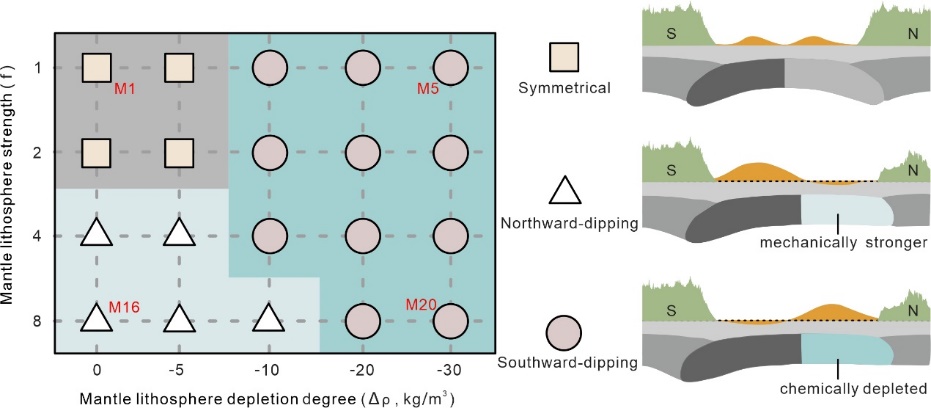 图3 克拉通岩石圈地幔强度和亏损密度变化对克拉通盆地基底形态影响的模式图。正方形代表对称的克拉通盆地基底,三角形和圆形分别代表“北倾”和“南倾”的克拉通盆底基底,且南克拉通在造山带下有更陡的俯冲