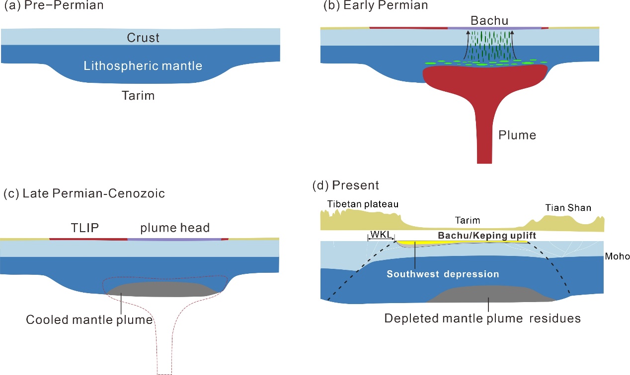 图4 塔里木克拉通的演化示意图。(a)二叠纪之前的塔里木地块;(b)早二叠世地幔柱改造塔里木岩石圈,导致大量岩浆岩出露于地表和岩石圈底部熔融;(c)地幔柱通过亏损的熔体残余物充填和晚二叠世以来的冷却再克拉通化塔里木岩石圈;(d)现今塔里木地区的岩石圈结构