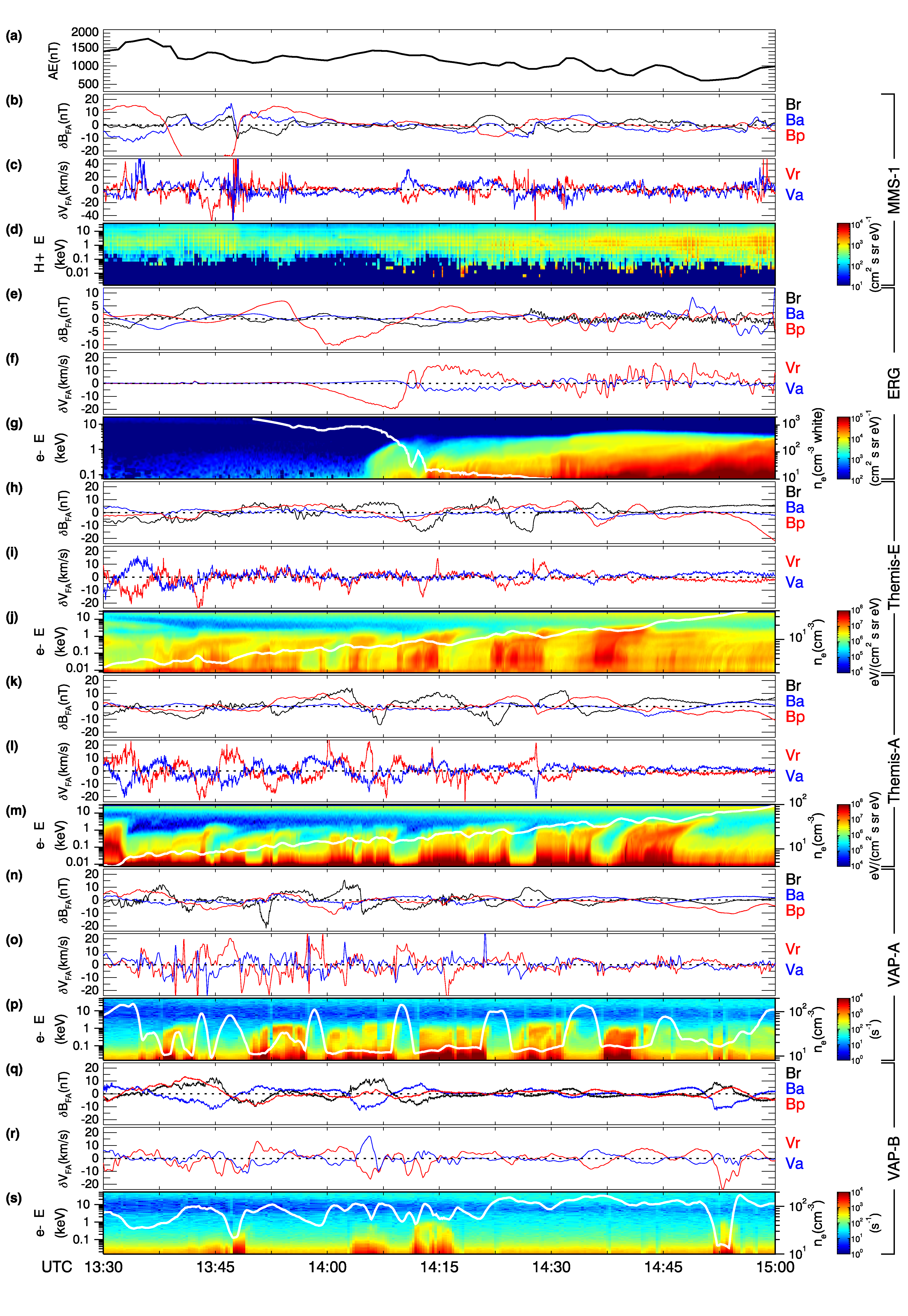 (1)能量在0.1-10 keV之间的高能质子和氧离子周期性注入能够作用于陡峭的等离子体层顶边界,导致PSW的激发。这一观点被质子和氧离子能通量的准周期同步扰动、AE指数的多重峰值以及近磁尾扰动的极向波的同时观测所证实。虽然之前的研究表明,在亚暴期间,PSW可能会被高能粒子注入所激发,但是该研究通过同时监测磁尾条件和黄昏侧PSW进一步识别了造成这种现象的粒子种类。