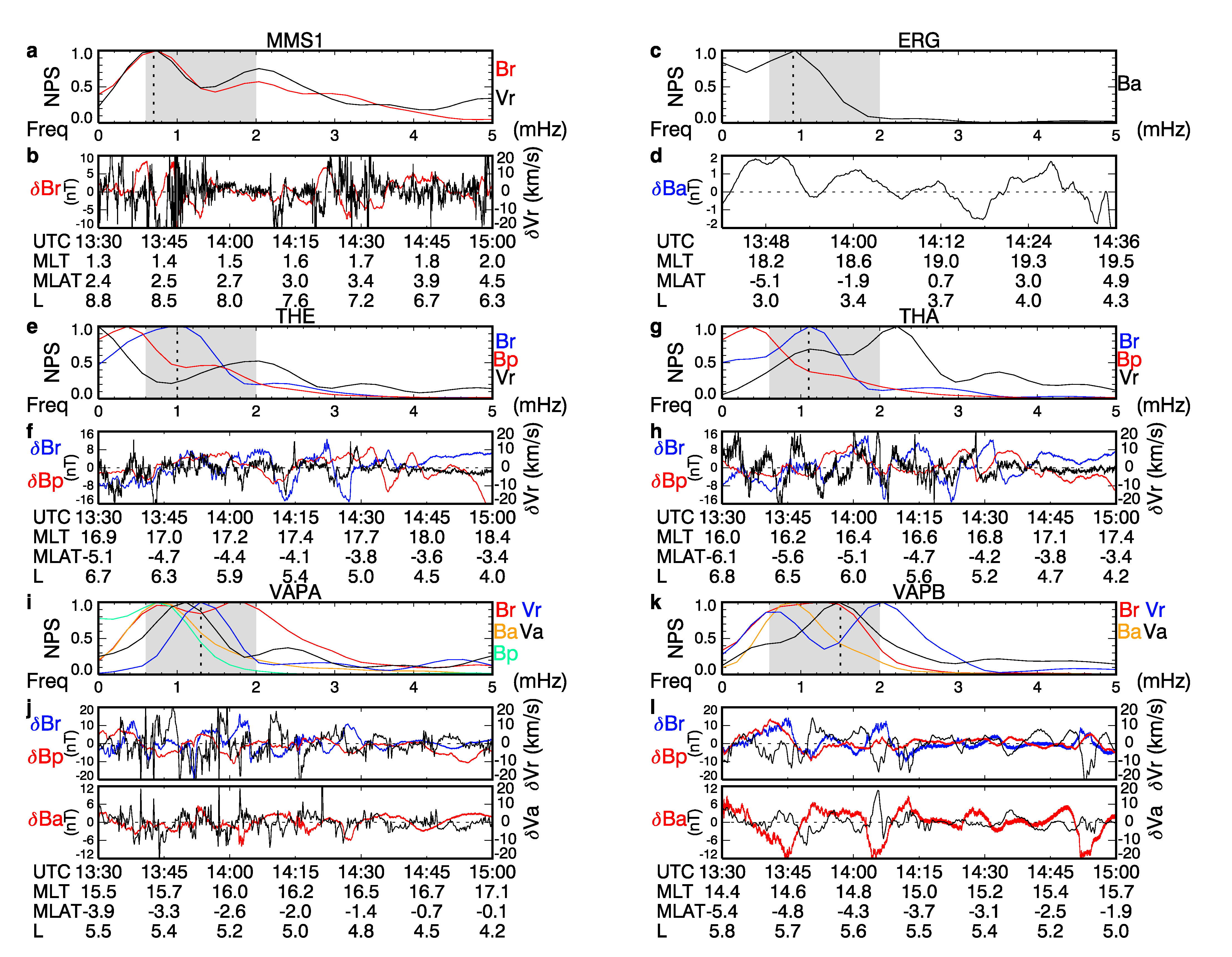 然而,关于PSW的激发、演化、频率选择、空间天气效应和波粒相互作用,许多关键问题仍然尚未明确。先前的研究表明,起源于日侧磁层顶的峰值频率为1-2 mHz的MSE可以沿着磁层顶表面自然地向磁尾传输,可能提供种子波动,尽管没有发生在开尔文-亥姆霍兹不稳定性的主要增长频率,这些波动随后也会通过晨昏侧的开尔文-亥姆霍兹不稳定性增长、合并和耗散。然而,在等离子体层顶上,无论是通过原位观测还是数值模拟,PSW的空间演化模式都未得到解决。