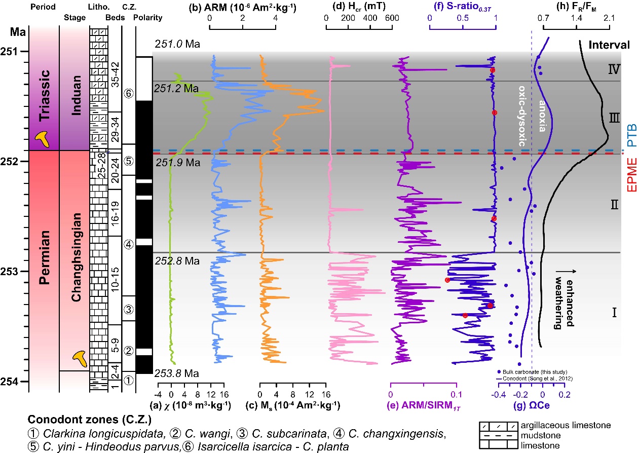 二叠纪末生物大灭绝被认为是地球历史上最严重的生物灭绝事件,在极短时间内(6.1±4.8万年),高达81%的海洋物种遭受灭顶之灾。揭示二叠纪末生物灭绝机制对于理解环境变化和生物演化之间的关系至关重要。前人通过地球化学指标(如生物标志化合物、铁组分)和同位素(如铀同位素等)分析,研究二叠纪末古海洋短期氧化还原历史。针对二叠纪末古海洋氧化还原状态及演化的科学问题,800彩票地球与行星物理院重点实验室地球与行星磁场及宜居性研究团队章敏博士后和潘永信院士,联合南京大学沈树忠院士,岩石圈演化国家重点实验室邓成龙研究员、秦华峰副研究员和侯祎斐博士后,以及中国海洋大学何况副教授,详细开展了浙江煤山“金钉子”剖面的环境磁学研究,获得了二叠纪末古海洋氧化还原状态演化的新结果。