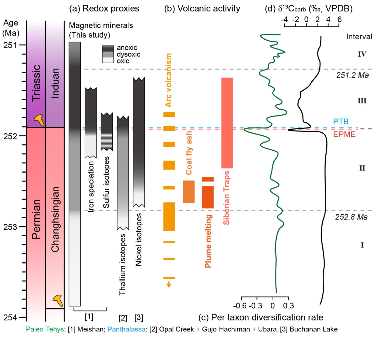 研究结果表明,煤山剖面长兴组和殷坑组的磁学指标变化自下而上可分为四段(Ⅰ-Ⅳ)(图1)。第Ⅰ阶段,磁性矿物以磁铁矿和赤铁矿为主,在第Ⅱ-Ⅳ阶段,磁性矿物则以磁铁矿为主,指示了古海洋浅海环境由氧化状态转变为贫氧-缺氧状态,这个转变约发生在252.8 Ma。结合前人的研究结果,如铊同位素(图2a)、全球碳同位素(图2d)以及生物多样性变化(图2c)等分析结果,表明二叠纪末古海洋氧化还原状态扰动时间比生物灭绝事件发生更早。此外,在第Ⅱ阶段,非磁滞剩磁与饱和等温剩磁比(ARM/SIRM1T)呈现逐渐减小的趋势(图1e),指示了磁铁矿粒径逐渐变大。在第Ⅲ阶段,磁化率(图1a)、非磁滞剩磁(图1b)、饱和磁化强度(图1c)均表现出先升高后降低的特征,指示了磁铁矿含量先升高后降低。电子显微学分析表明,煤山剖面中磁性矿物主要来自陆源碎屑输入,且陆源风化指标(图1h)与磁性矿物的粒度和含量变化表现出类似的特征,反映了大陆风化强度的变化。