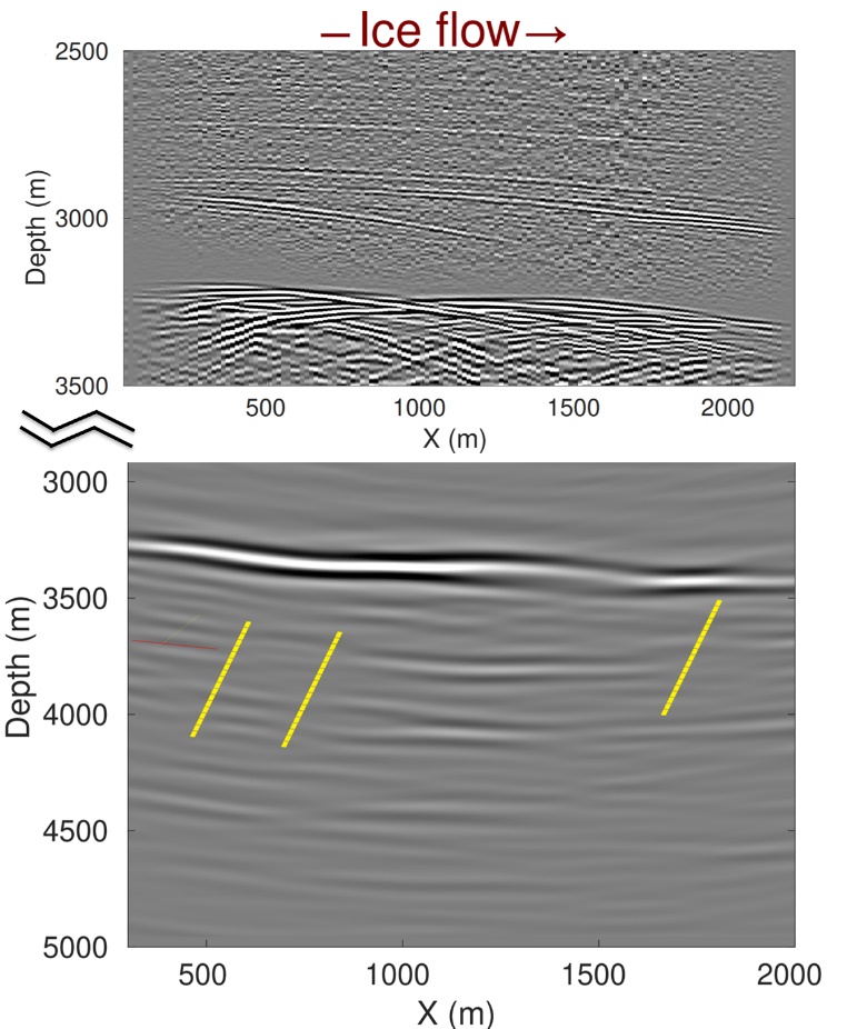 该项研究使用漏能、本征振型联合反演方法,增强了对冰盖浅层纵波速度反演的约束,通过分析纵横波速度比随深度变化,推测出冰盖浅层孔隙度变化情况。即随着深度的增加,由于重力作用浅层浮雪会逐渐压实并在70米深处达到孔隙闭合极限,之后随着深度的增加,孔隙度会有所上升并恢复至标准冰的水准。该压实深度与冰架的稳定性存在联系,可进一步用于估计冰架失稳的可能性。使用冰面接收的冰盖内部不连续界面反射纵、横波地震数据,研究团队对冰盖内部界面以及冰-岩界面进行了成像,成像结果表明冰-岩界面起伏较为剧烈、沉积层内具有非均质性。通过进一步分析纵、横波反射特征,推测出冰盖内部的流体替换可能会引起较强的PP反射和较弱的PS反射。由于流体的替换,不同冰层间的摩擦力会发生改变,进一步导致冰层间相对滑动速度的变化以及冰晶体对称轴的定向排列。该项研究结果为因冰晶体对称轴的定向排列变化导致的地震各向异性提供了一种成因解释,进一步增进了对冰盖动力学过程的认识。