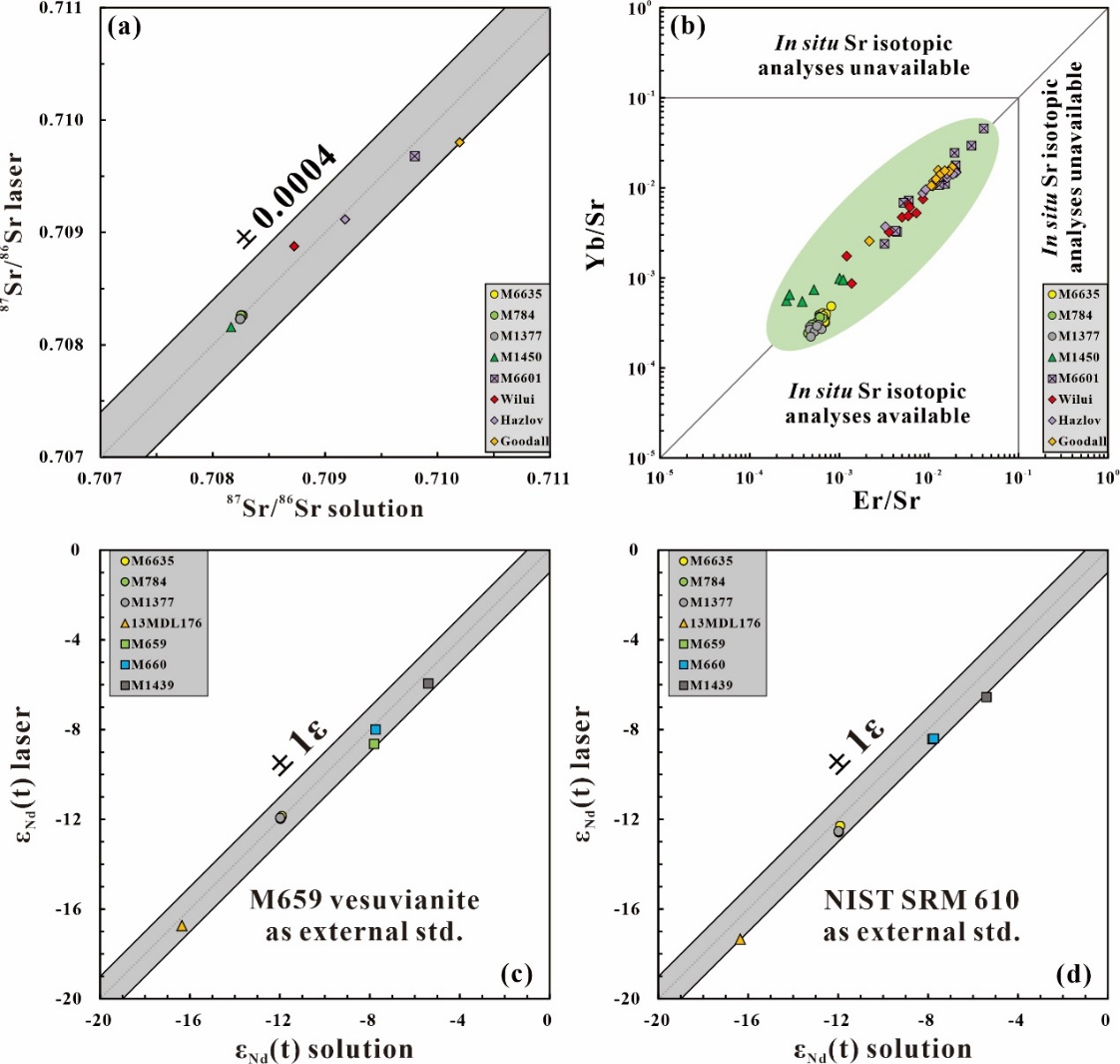 基于上述问题,800彩票公共技术中心流体包裹体实验室卫钦迪工程师及其合作者,研发了符山石激光微区原位Sr-Nd同位素方法,使用Jet锥与X锥的锥组合并辅助以4ml/min的氮气来提高信号强度,采用两个实验室内部符山石微区标准物质(M6635和M659)(图2),分别对来自不同国家和地区的11个符山石样品进行激光原位Sr-Nd同位素测试,获得了与溶液方法一致的结果(图3a、图3c),充分证明该方法的可行性与可靠性,同时评估了符山石样品的Er/Sr和Yb/Sr比值(分别为0.0003~0.04和0.0002~0.05;图3b)对Sr同位素测定的影响,表明双电荷离子对84Sr和86Sr的干扰可以被准确校正。此外,还评估了基体效应对符山石Sm-Nd同位素原位分析的影响,分别使用M659符山石和NIST SRM 610玻璃作为标准物质校正其它符山石样品(图3c & d)。结果表明,采用基体匹配的标准物质校正符山石样品得到的值更接近于溶液方法得到的推荐值。因此在激光原位Sm-Nd同位素研究中,具有均一的Sm-Nd同位素组成的天然矿物标样是分析首选。我们的工作表明,M6635、M784、M1377和M1450符山石含有较高的Sr含量并且具有相对均一的Sr同位素组成(图4),可作为未来潜在的微区Sr同位素分析标样;M659的147Sm/144Nd不确定度最小,并且具有相对均一的143Nd/144Nd比值(图2b),可作为未来潜在的微区Sm-Nd同位素分析标样。