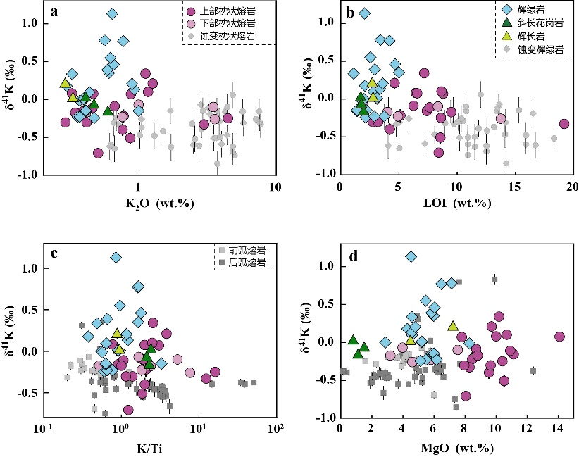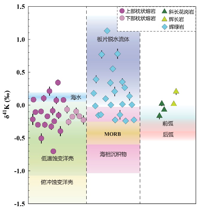 塞浦路斯Troodos蛇绿岩保存了完整的蛇绿岩岩石序列,被认为是特提斯洋初始俯冲阶段的产物,是研究俯冲起始和熔/流体-岩石相互作用的理想样品。800彩票的博士研究生潘旗旗与导师肖燕副研究员及其合作者,对Troodos蛇绿岩洋壳序列的枕状熔岩、辉绿岩、辉长岩和斜长花岗岩等50个样品开展了岩石学、元素地球化学和K同位素分析。结果显示,这些岩石具有异常重的K同位素特征(图1),辉长岩和斜长花岗岩K同位素变化范围较小,分别为0.01 ~ 0.20‰和−0.17 ~ 0.02‰;辉绿岩的δ41K值有较大的变化范围(−0.24 ~ 1.13‰);下部枕状熔岩和上部枕状熔岩的δ41K值分别为−0.26 ~ −0.07‰和−0.71 ~ 0.34‰。