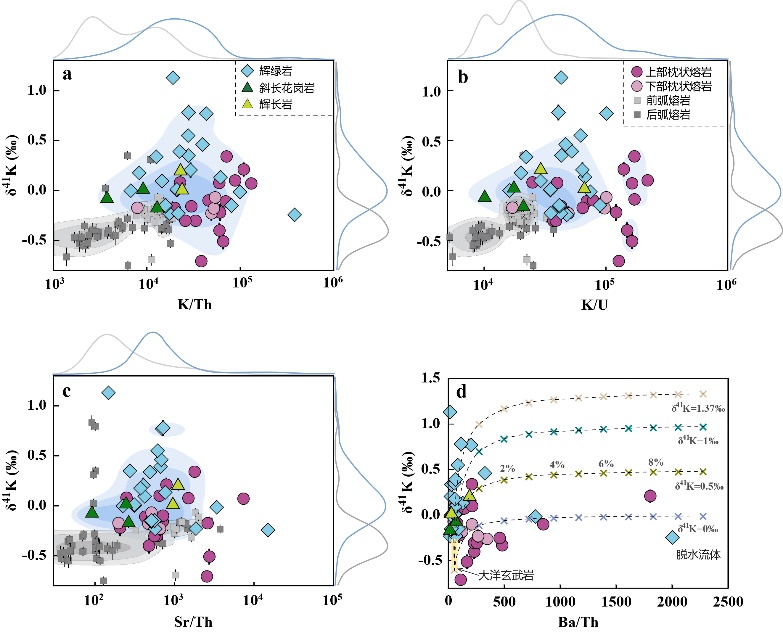 除4个样品外,大多样品的K2O和烧失量与经历过低温蚀变的样品存在显著差异,且其K同位素组成明显重于后者(图2a、图2b)。这表明低温蚀变对K同位素的影响可以忽略不计。这些样品的K同位素组成明显重于俯冲沉积物和蚀变洋壳(−1.64 ~ −0.05‰),排除了地壳物质直接加入的可能性。其K同位素组成与MgO含量和K/Ti比值之间不存在相关性(图2c、图2d),排除了分离结晶对样品K同位素组成的影响。同时,相对于前弧和后弧岩浆岩,这些样品具有更高的K/Th、K/U 和 Sr/Th 比值(图3a-c),结合二元混合模型计算结果(图3d),揭示了Troodos蛇绿岩洋壳序列异常重的K同位素组成来源于初始俯冲过程中板片脱水流体加入其岩浆源区。