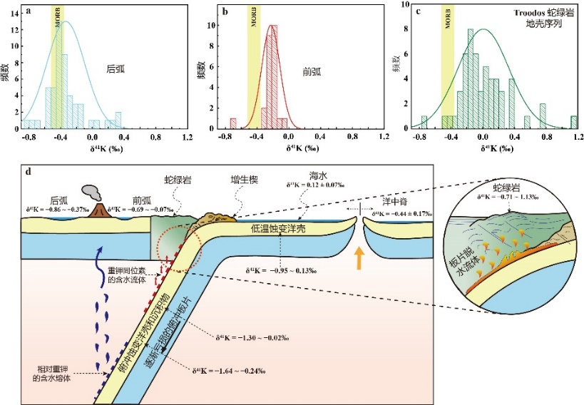Troodos蛇绿岩中的重K同位素特征反映了新形成的俯冲系统中,板块在浅部脱水过程中K同位素的分馏,此时重K同位素优先进入含水流体。随着俯冲深度的增加,含K矿物相开始分解,逐渐形成K同位素相对较轻的含水熔体,这解释了岛弧地区相对较轻的K同位素特征(图4)。初始俯冲过程含水熔/流体成分的演化导致了横向剖面上从蛇绿岩到前弧、后弧逐渐变轻的K同位素特征。因此,俯冲带作用如同地球化学过滤器,通过产生脱水熔/流体和同位素被改造的板片,前者向上迁移,改变上覆岩石成分,后者则进入深部地幔,影响地幔的长期地球化学演化。