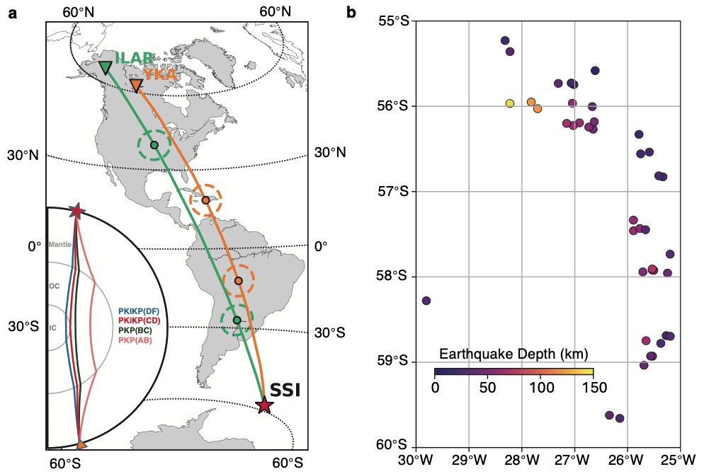随着地震学观测的积累和研究方法的创新,地震学家对于地球内核运动状态的认识逐渐深入。最近,中国科学院地质与地球物理所地球与行星物理重点实验室王巍副研究员与美国南加州大学John Vidale教授、美国康奈尔大学庞冠宁博士后、犹他大学Keith Koper教授和美国南加州大学博士生王若妍等合作,对1990-2023年间在加拿大(Yellowknife Array,YKA)和美国(Eielson Array,ILAR)的地震台阵记录到的南三明治岛(South Sandwich Island,SSI)的重复地震(图1)记录开展了详细分析,揭示了近20年来内核差速旋转的振荡轨迹,明确给出了内核振荡运动模式的地震学证据。
